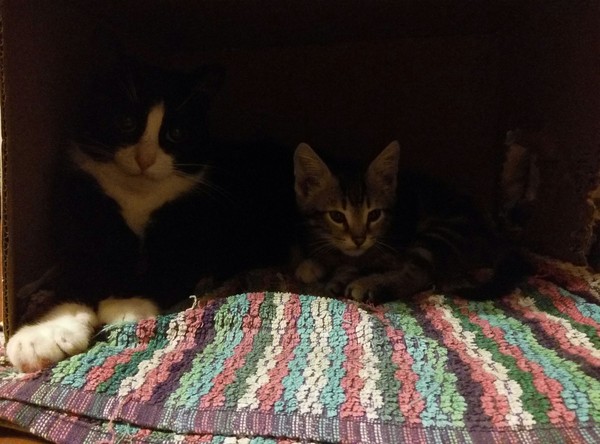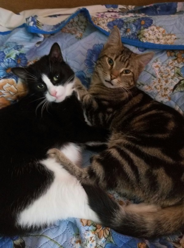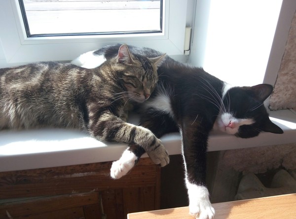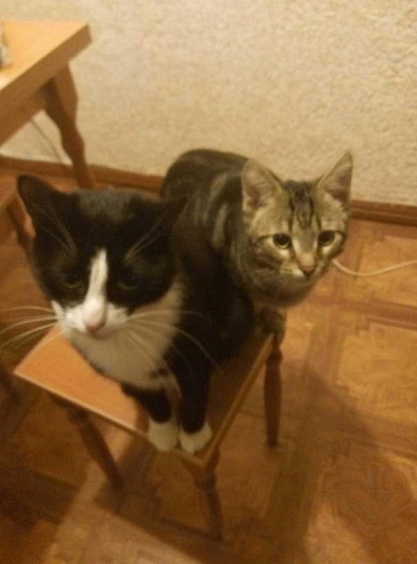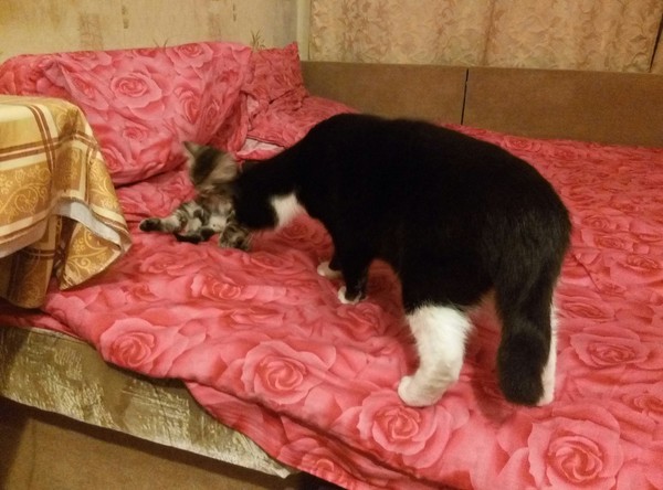 А он трясется весь. Замерз видать. И такой прикольный на ощупь... Вобщем, хоть дома и есть уже кот, взял этого с целью "хоть накормлю". Когда поднялся, как раз Плюшевый наелся и балдел, а в миске ещё немного оставалось. Ушастый за 15 секунд управился с остатками обеда и уснул на руках.