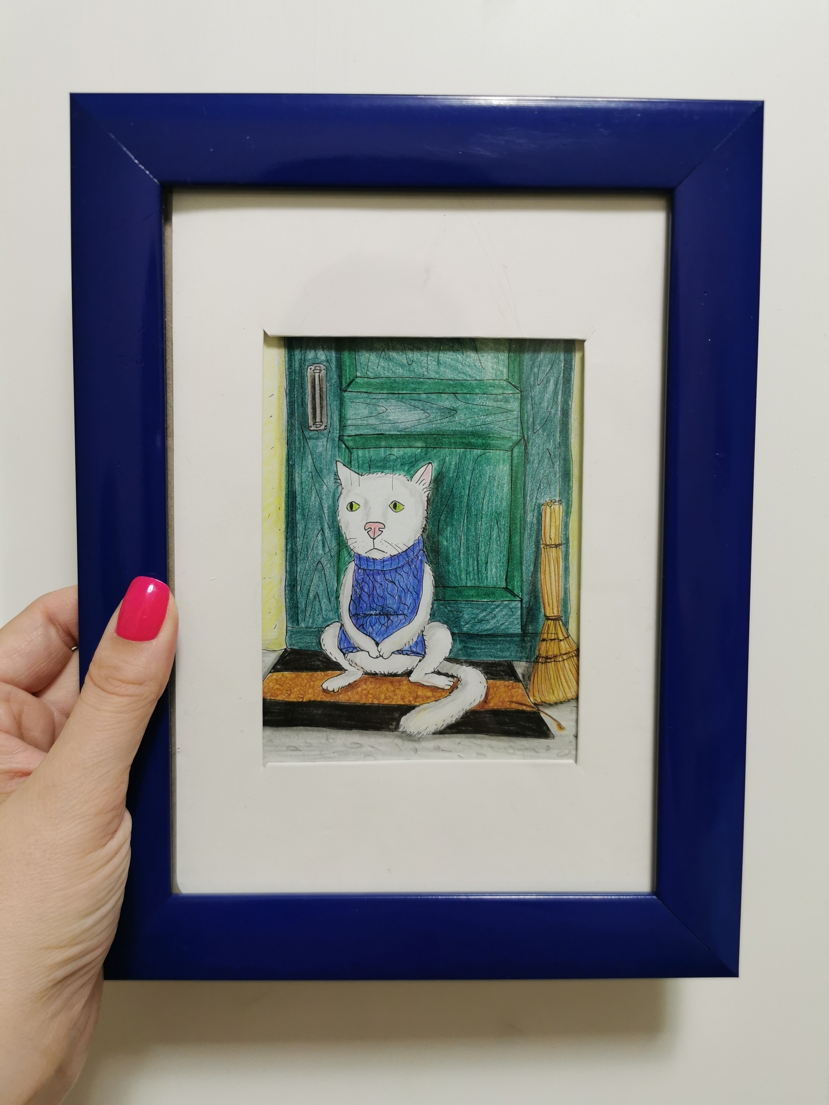 Однажды мне приснился белый кот с разбойничьей мордой в синей шерстяной жилетке крупной вязки. Он шёл по своим плутовским кошачьим делам, деловито оглядываясь по сторонам, будто никакой жилетки на нём не было — вообще ничего особенного. Образ был настолько яркий, что не отпускал до тех пор, пока я его не нарисовала. На картинке кот почему-то сидел перед входной дверью, на коврике. Рядом стоял веник. История требовала пояснения... Так появился этот текст.