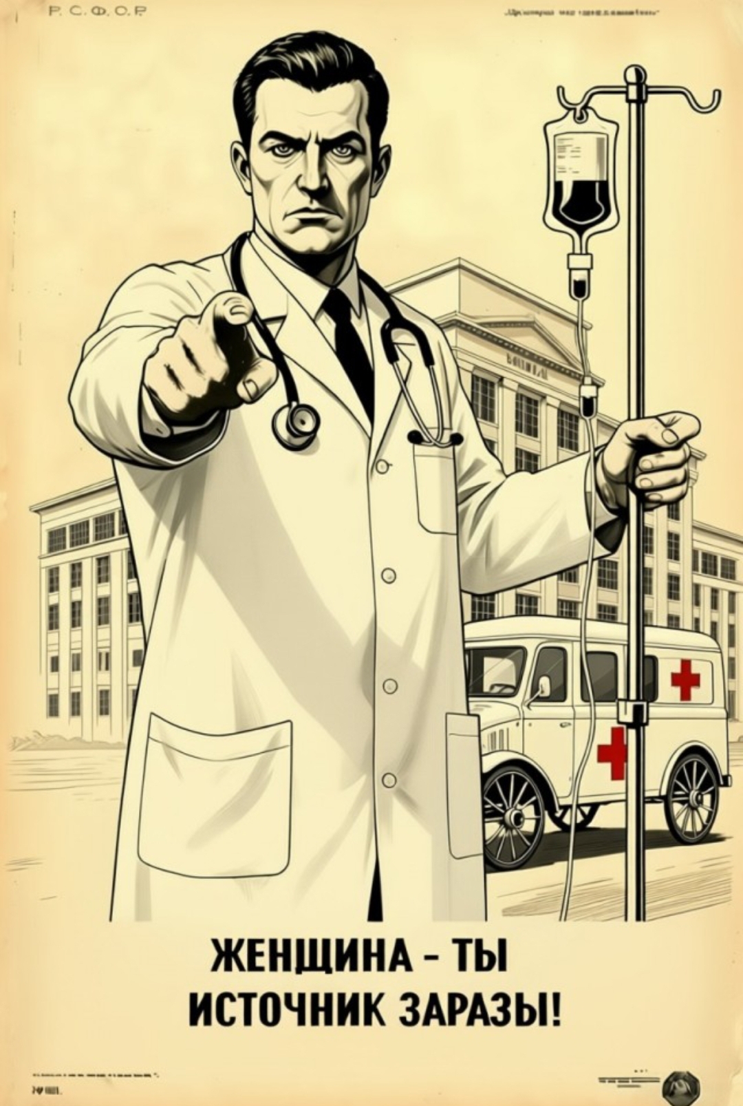 ·Центральная фигура — врач в белом халате, чей жест сочетает медицинскую необходимость и революционную требовательность