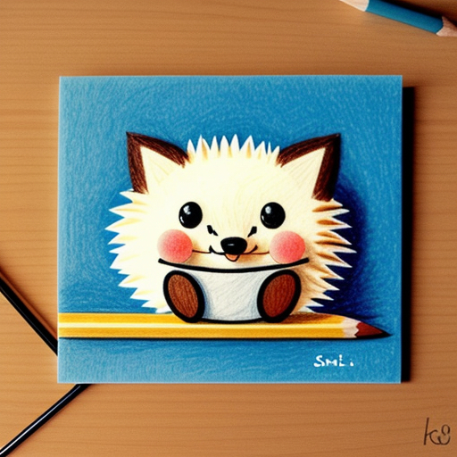 a small hand-drawn on a piece of paper hedgehog holds a real simple pencil in its paws, simple minimalistic cartoon drawing