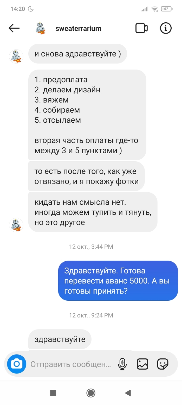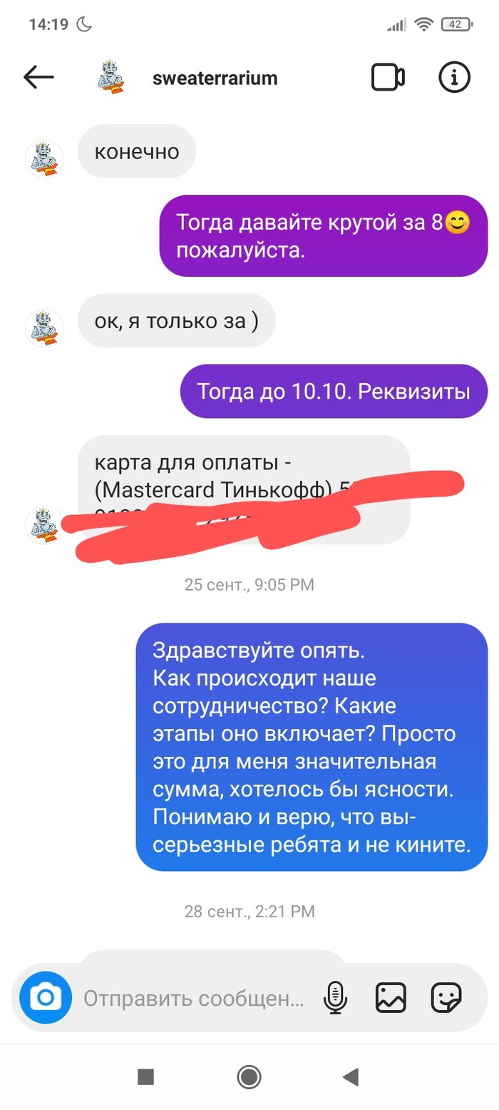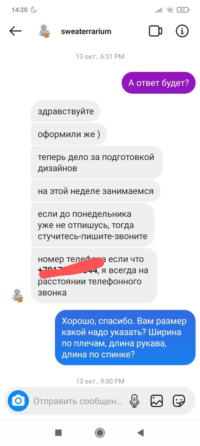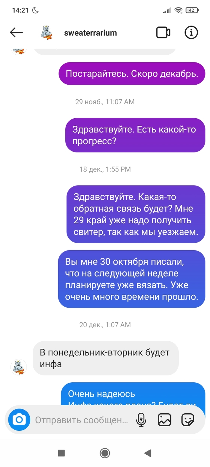 Прошло три месяца. Между этими переписками было несколько созвонов, по смыслу- мы всë сделаем и всë успеем. 28.12 человек взял трубку раз на 17й и начал разговор словами:" Вы специально мне так рано звоните, чтобы разбудить? " Нет, сука, просто так я решила позвонить. И ещё с таким наездом, типа хера ли я столько раз звоню.