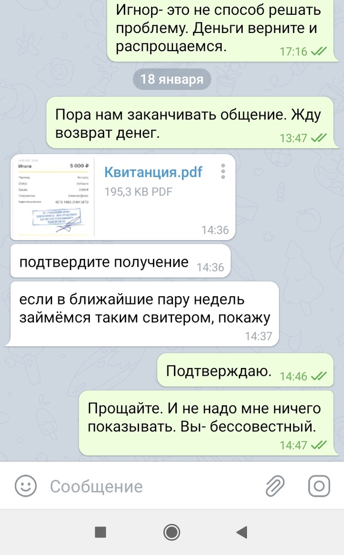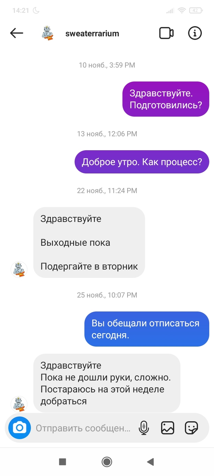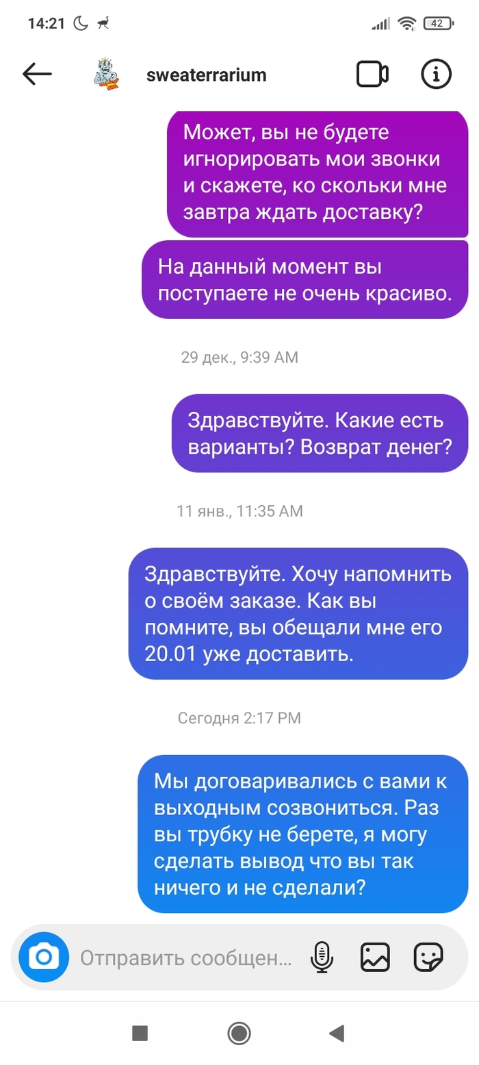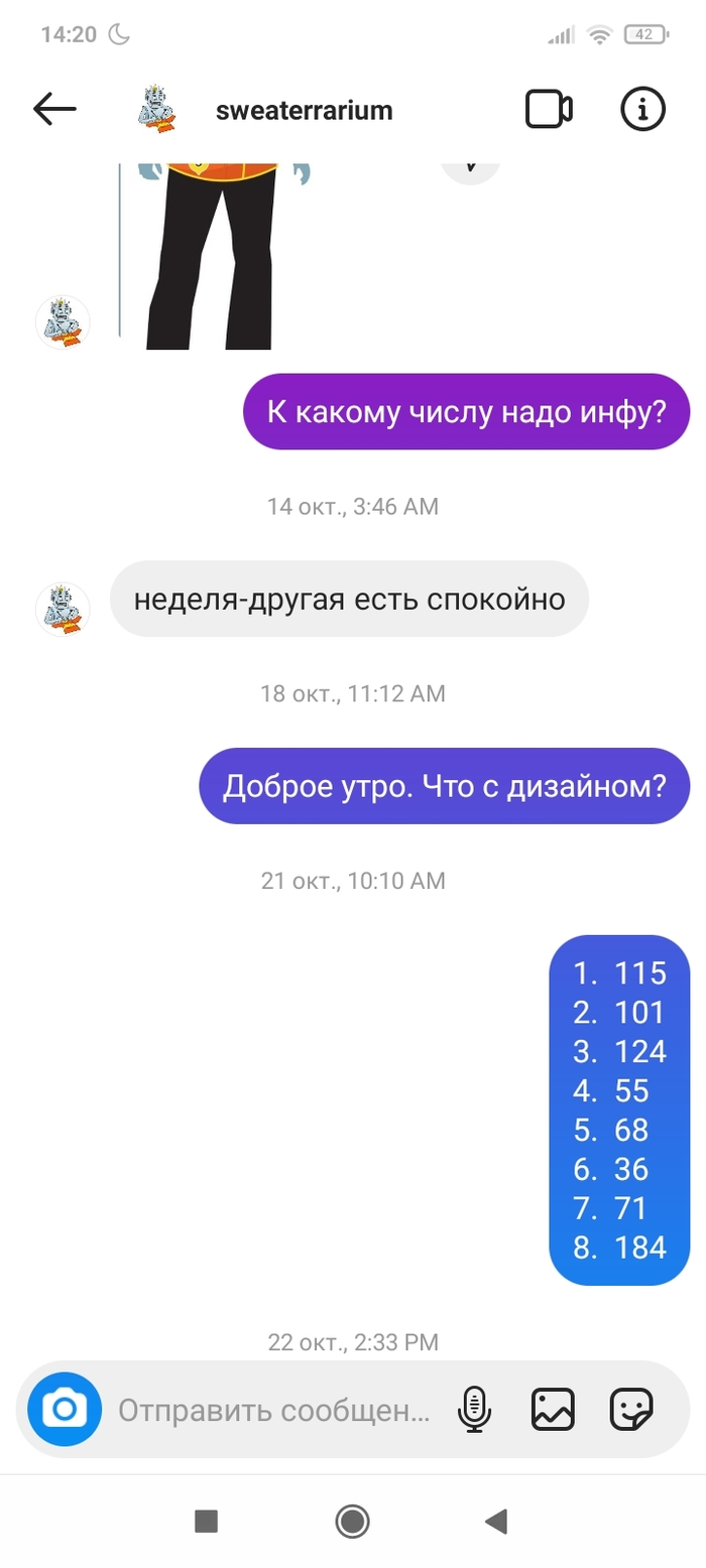 Прошло три месяца. Между этими переписками было несколько созвонов, по смыслу- мы всë сделаем и всë успеем. 28.12 человек взял трубку раз на 17й и начал разговор словами:" Вы специально мне так рано звоните, чтобы разбудить? " Нет, сука, просто так я решила позвонить. И ещё с таким наездом, типа хера ли я столько раз звоню.