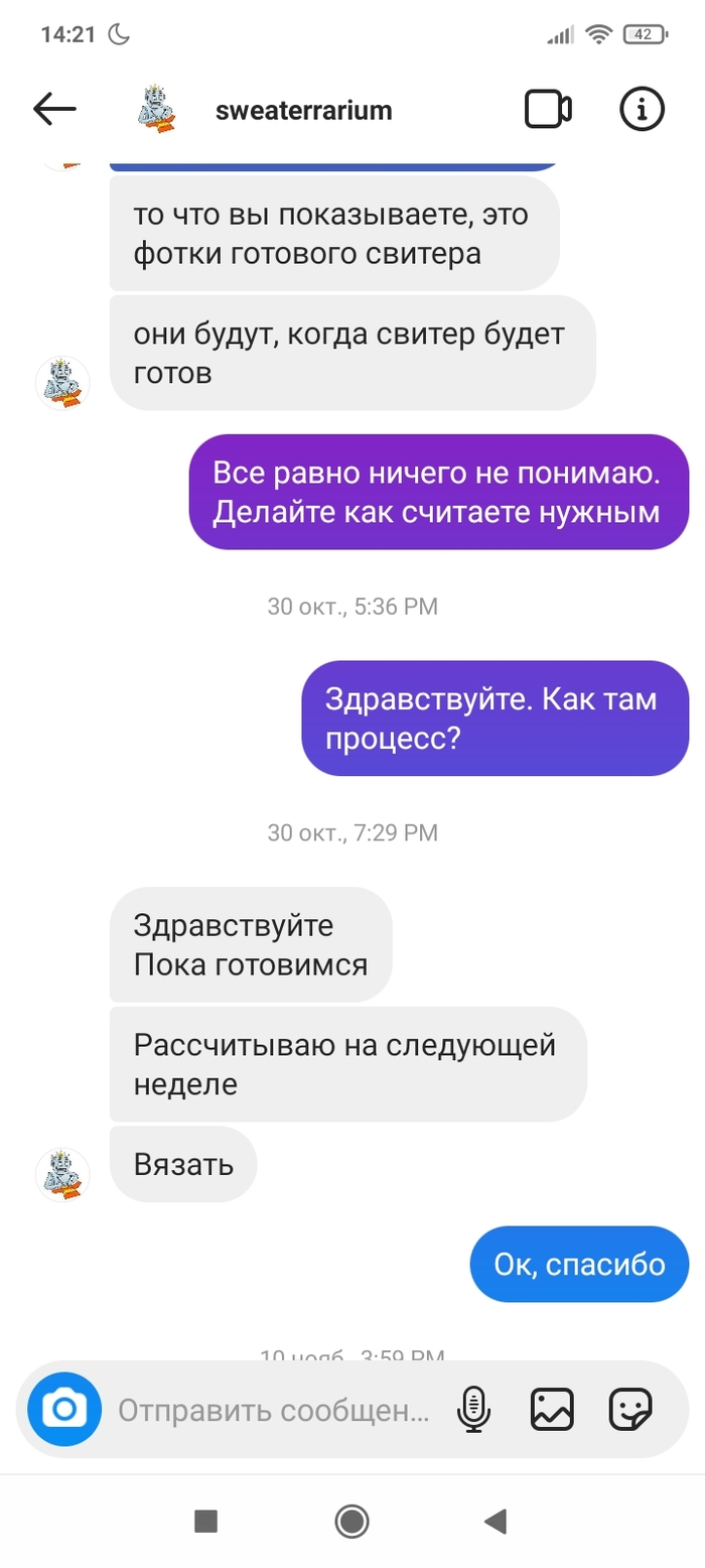 В итоге- ничего не готово, свитера нет, но после праздников с 10.01 они начинают работу и к 20.01 свитер будет у меня 100%.