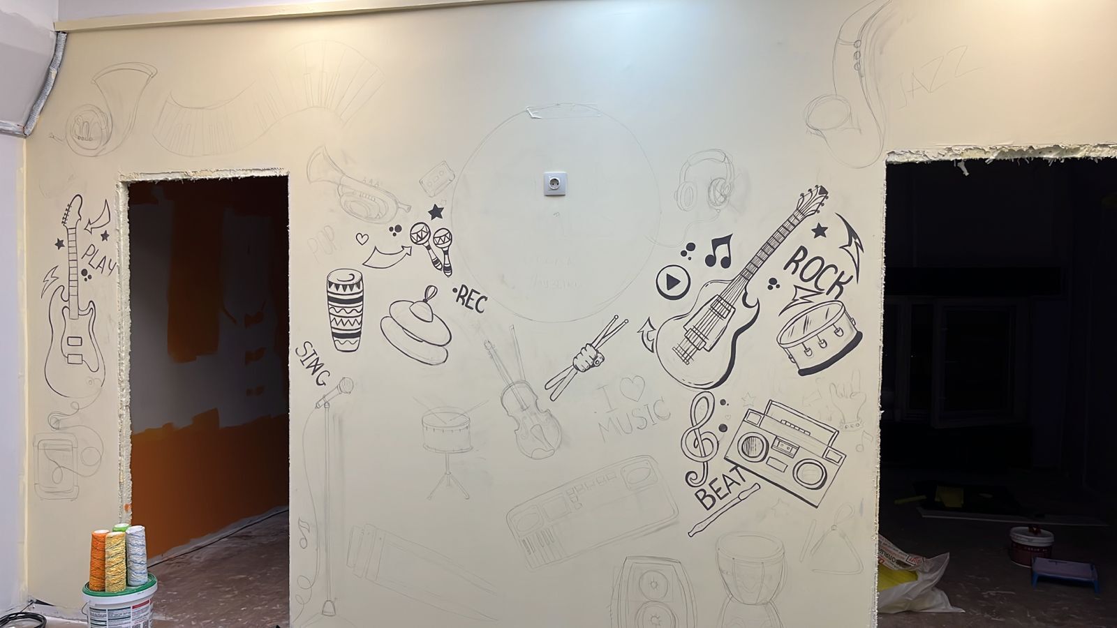 Когда красили кабинеты, параллельно начинали обклеивать акустическим поролоном уже покрашенные, в лобби начали разрисовывать стены, давно мечтал.