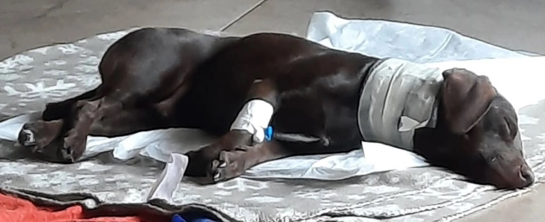 У собаки сложная травма позвоночника и перелом тазобедренной кости.