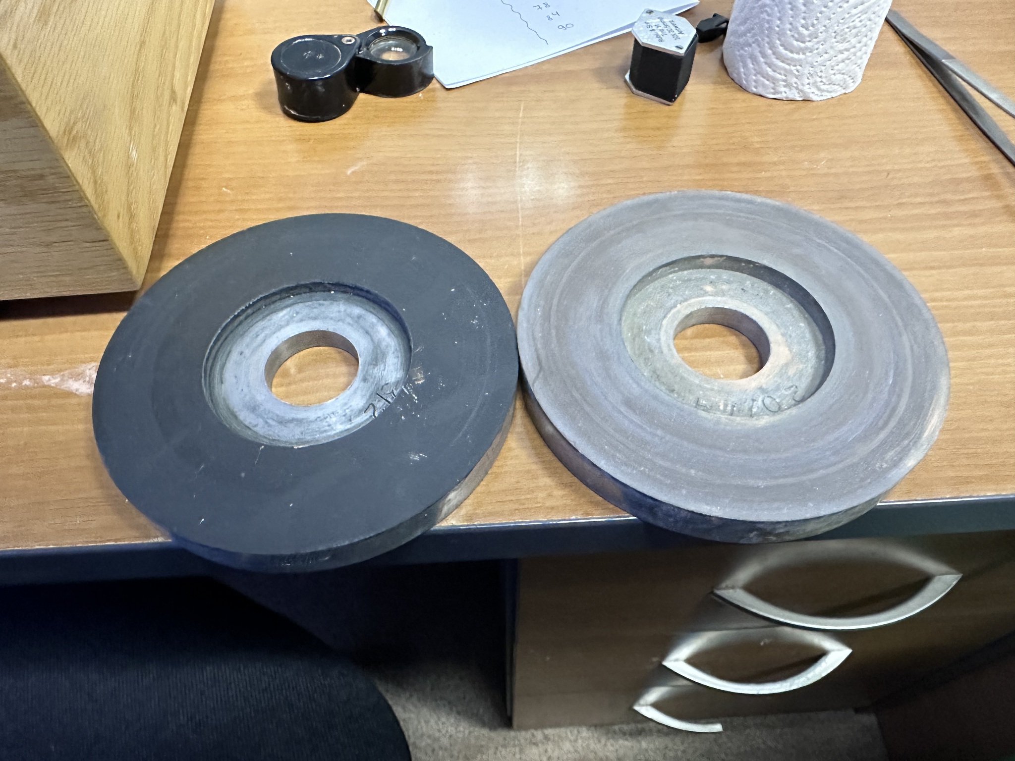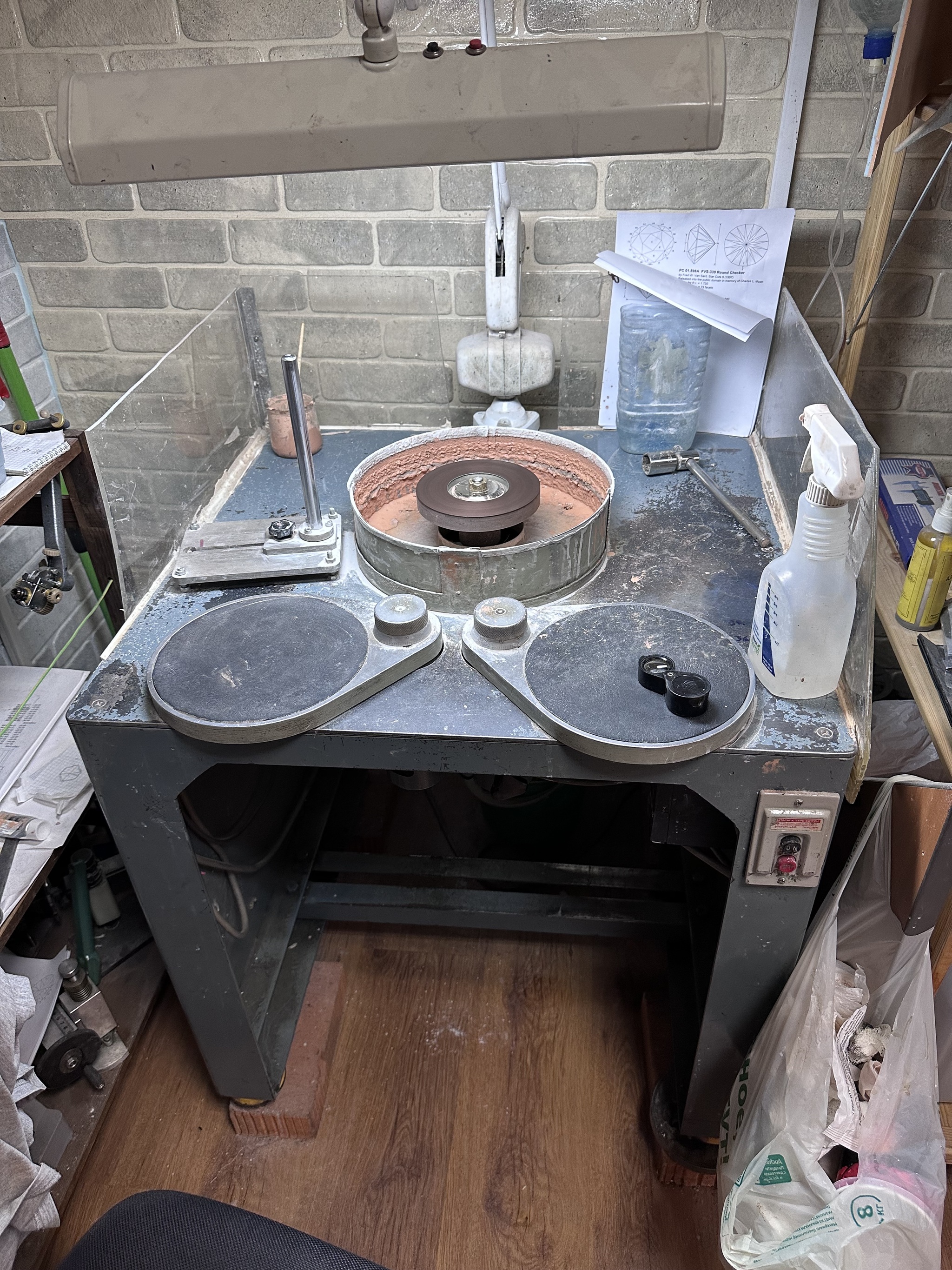 А что же у нас стало за века с поверхностью для полировки? Конечно же, на смену плоскому камню и песочку пришли более современные («ха-ха» сказали гончары) виды оборудования. За редким исключением, ограночный станок комплектуется планшайбами разных степеней абразивности. Планшайба – это такая тяжелая (часто оловянная) штука, которая ставится сверху на шпиндель станка и, благодаря вращению, «стачивает» камень. Подразделяются они, в зависимости от типа и размера абразивного материала, на обдирочные (задать условную форму всего камня в несколько быстрых касаний), ограночные (установить грани на камень и «подтянуть» их друг к другу) и полировочные (как понятно из названия, чтобы отполировать грань до отсутствия дефектов). Предвосхищая возможные вопросы – да, можно сразу полировальной планшайбой и форму задать, и грани установить – вот только ввиду износа отполировать начисто ей уже не получится. Полимер, содержащий в себе абразив (обычно, корунд или алмаз, а вот состав полимера производители планшайб держат в секрете) наберет в себя огромное количество шлама – отходов обработки, тонкозернистых микрокристаллов – и будет вместо чистой, гладкой поверхности выдавать дефекты огранки: царапины, т.н. «седину» (множество микроскопических царапин, образующих бело-сероватую поверхность), сколы и прочее-прочее. Так что тут как с наждачной бумагой – чем мельче абразив, тем тоньше съем и чище поверхность.
