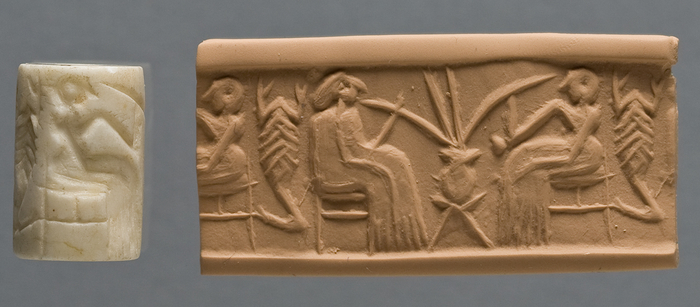 (Двое людей пьют пиво. Оттиск цилиндрической печати. Ок. 2600-2350 года до н. э. Фото: The University of Chicago)
