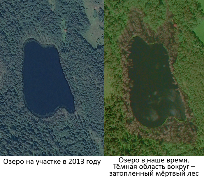 Все эти 5 лет там хозяйничали другие ребята, деятельность которых привела к затоплению большой площади леса. И это даже не люди. Этими ребятами были местные бобры, которые за 5 лет успели основательно здесь закрепиться и построить целую систему плотин на ручье, выходящем из озера. В результате площадь озера сильно выросла, лес на берегах был затоплен и полностью убит, окружающие земли заболочены.