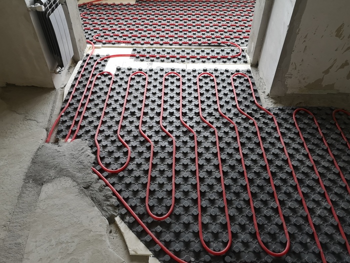 После завершения кладки и успешных испытаний камина, начали устройство теплого пола (решено было делать водяной). Поскольку уровень пола лоджии изначально был ниже пола квартиры, без проблем разместили 80 мм пеноплекса, уложили трубу и залили все это 40 мм стяжки. Уровень пола на лоджии как раз сравнялся с квартирным.