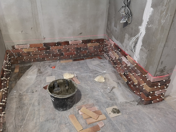После этого начали самый трудоемкий процесс - отделку стен декоративным камнем. Так как мы не ищем легких путей, ни один из представленных в продаже цветов камня нас не устроил и мы купили 6 или 7 разных цветом и вручную миксовали их в процессе кладки :-)