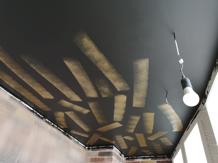 Потолок решили покрасить просто в черный. Но потом показалось, что он слишком сильно давит сверху и разбавили его золотыми мазками. Чистая импровизация жены :-)