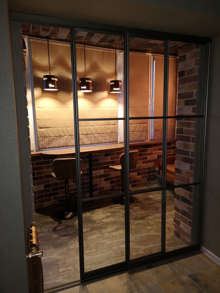 Ну и для некоторого зонирования решили все же отделить кухню от лоджии при помощи дверей-купе. Установили обычные мебельные двери (которые ставят в шкафах-купе) из профиля Аристо с доводчиками. Вышло отлично. Конечно, они не герметичные и шумоизоляцию не дают, но это и не требовалось.