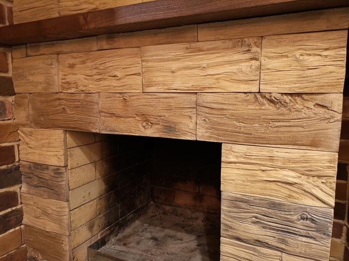 Долго думали, чем сделать облицовку камина и случайно на каком-то стройрынке увидели декоративный камень "под дерево". Ничего другого уже искать не хотелось, заказали именно этот.