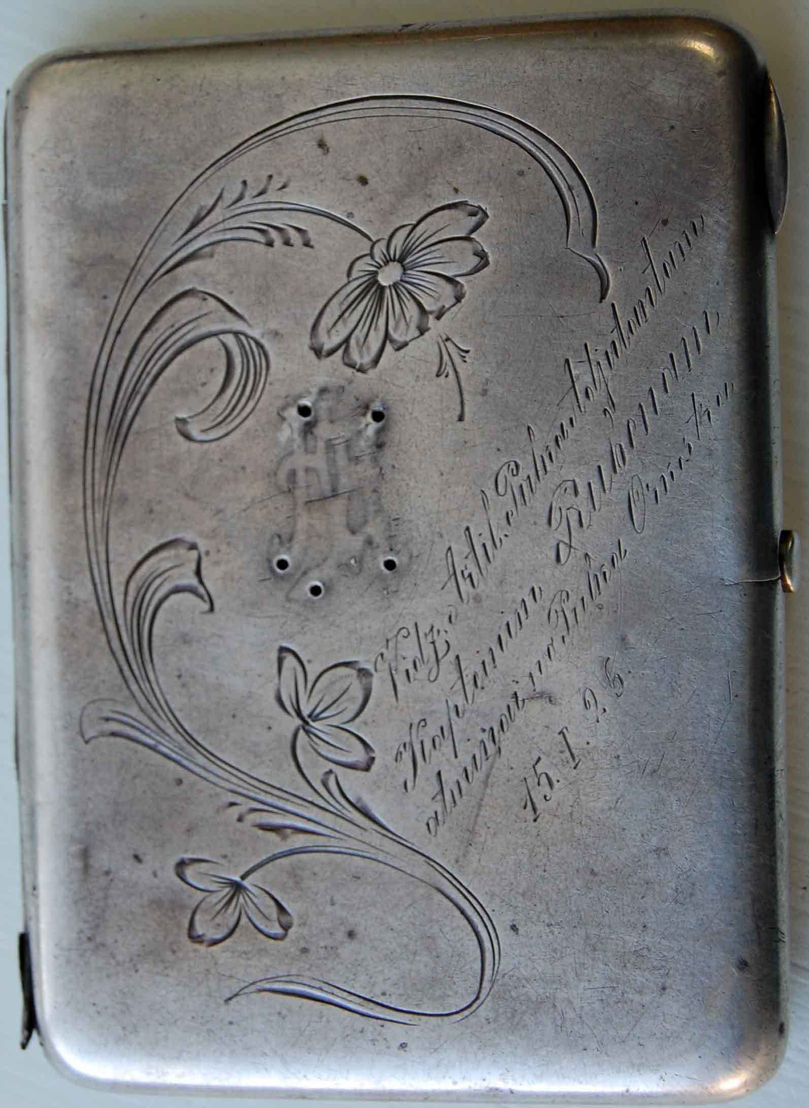 Лет десять назад это было, сегодня просто вспомнилось, когда старые фотки перебирал. Занимались мы проектом "Жди меня" (не в том смысле, что по ТВ вели, а принимали от народа заявки на поиск людей и передавали на сайт проекта, но иногда и сами кого-то находили). И однажды к нам пришел один пенсионер. История такая: во время войны его отец был офицером. Воевал на Западном, Волховском и Ленинградском фронтах. Прошел путь от курсанта до гвардии старшего лейтенанта и командира батареи. Приехал же он домой с трофеем, взятым у одного из пленных немецких офицеров. Этот трофей - серебряный портсигар.