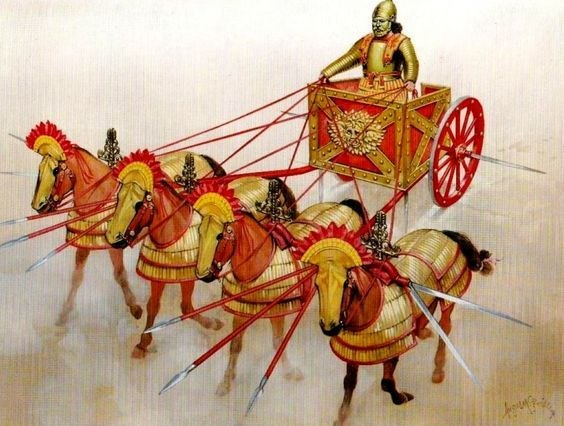 Боевые колесницы фиксируются по всему Древнему миру эпохи поздней бронзы - от Греции до Китая. Но самыми главными апологетами колесниц были индоарии, так что неудивительно, что колесница представлена в игре. Знаменитые сражения при Кадеше в 13 веке между хеттами и египтянами до н.э. и при Муе в 11 веке до н.э. между войсками Шан и Чжоу также велись с активным применением колесниц.