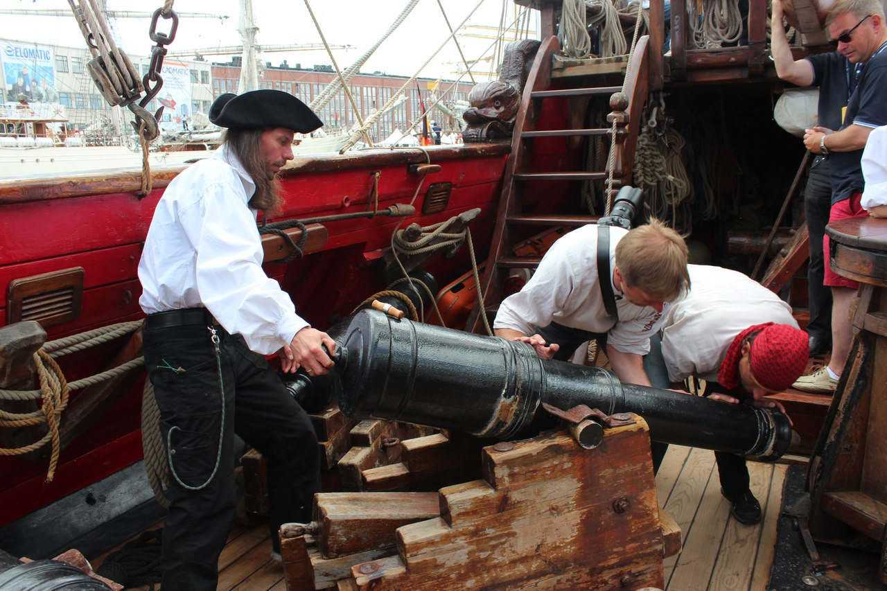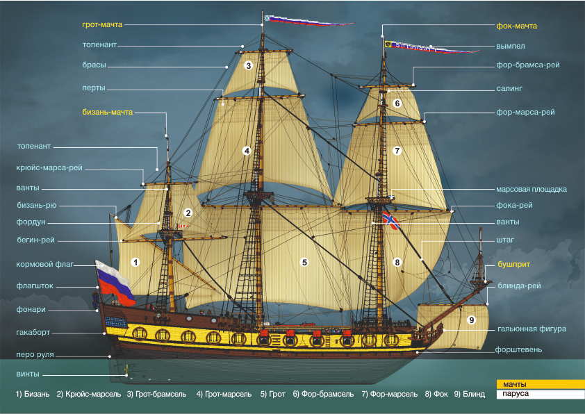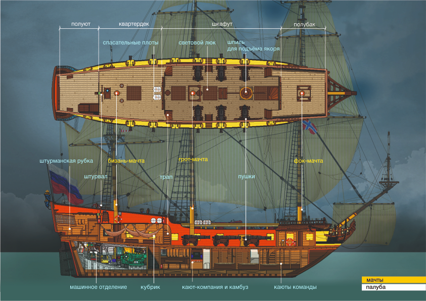 Выше пушечной палубы историческая достоверность сохранена: все мачты и стеньги, бегучий и стоячий такелаж, шпиль, пушки, декоративное убранство, штурвал и рулевое устройство, трапы и люки сделаны с максимально возможным приближением к историческим.