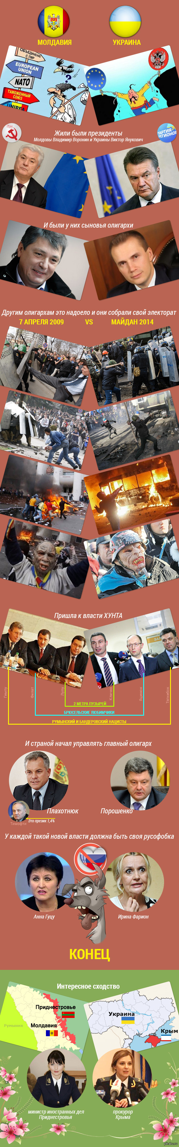 Как житель Кишинёва давно заметил сходство и вообще я так и думал что на Украине всё идёт к этому. Так же могу добавить что налоги и цены на всё начиная от энергоносителей,топлива и еды и заканчивая коммуналкой выросли как минимум на 25% , у моей мамы малый бизнес , до 2010 года всё было нормально а потом становилось только хуже и хуже , моя семья не самый страшный пример. Прогнали одного вора что-бы на его место поставить 3-их голодных которые будут воровать в 3 раза больше и при этом вести войну друг с другом за банки и заводы.А честная и правильная Европа не вмешивается , более того поддерживает нашу власть , хотя народ давным давно её возненавидел.У нас даже дети в курсе кто и что ворует в этой стране а Европа не , не слышала.