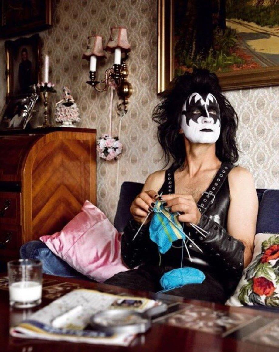 11. Американский вокалист, бас-гитарист и один из основателей хард-рок группы «KISS» Джин Симмонс, выступающий под сценическим псевдонимом The Demon вяжет спицами. 1980 год.