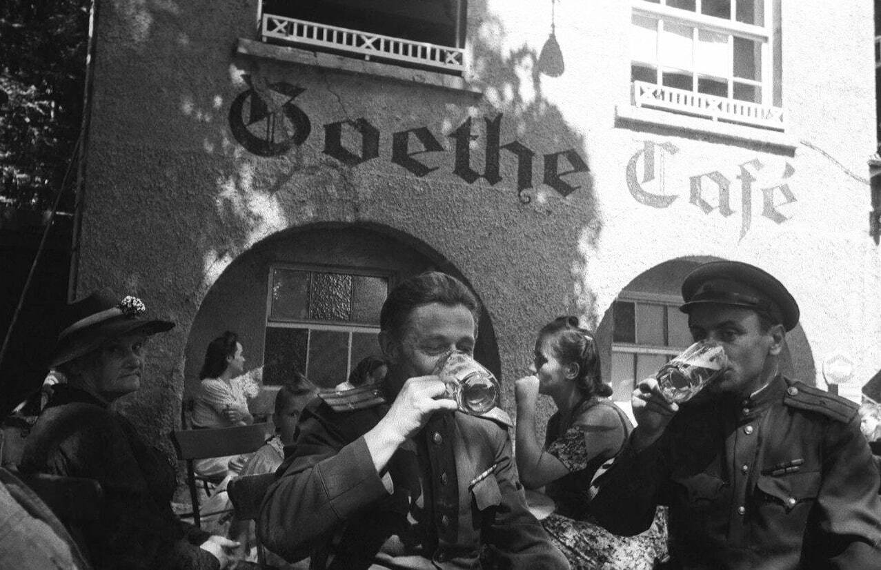 10. Поэт Евгений Долматовский (справа) и неизвестный офицер пьют пиво в кафе в Вене на Mariahilferstrasse 20. Женщина между ними на заднем плане — знаменитый советский фотокорреспондент Наталья Боде. Май 1945 года. Австрия.