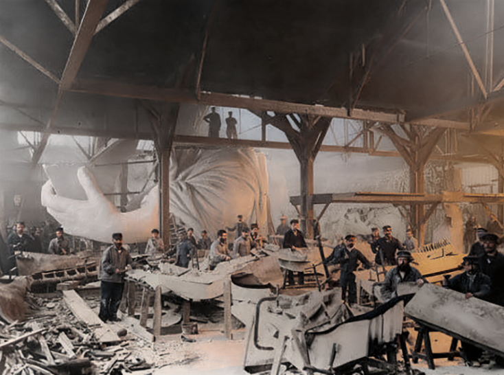 Эта фотография запечатлела процесс сборки статуи Свободы в мастерской французского скульптора Фредерика Бартольди в Париже. Статуя была подарком Франции Соединенным Штатам в честь столетия американской независимости и символизирует дружбу между двумя народами, а также свободу и демократию.
