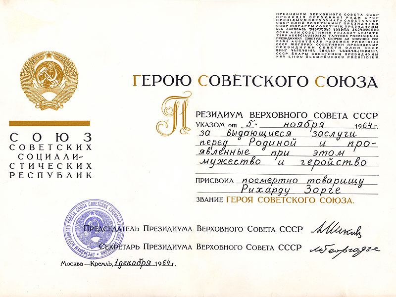 "Человек, для которого не было тайн". Грамота о присвоении звания Героя Советского Союза разведчику Рихарду Зорге.