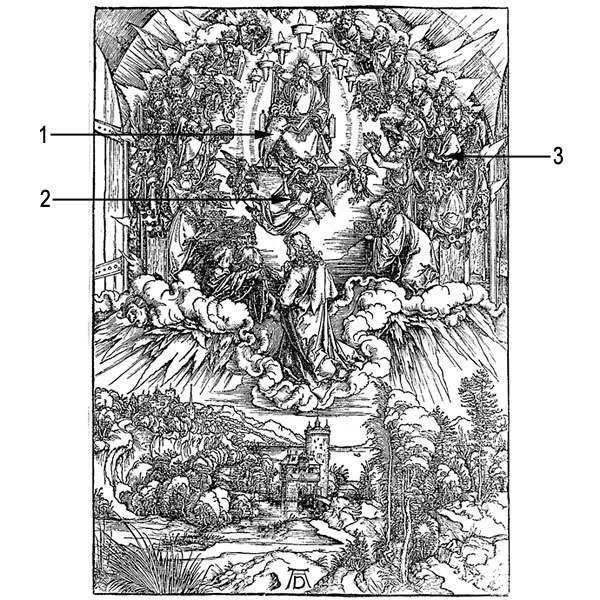 Видение небесного престола (гравюра № 2). Апостол видит перед собой Творца, держащего в руке запечатанную Книгу Судеб (1). В другой руке у Пантократора — семь звезд (2), которые символизируют ангелов-покровителей семи самых крупных из первых христианских общин — в Эфесе, Смирне, Пергаме, Фиатире, Сардисе, Филадельфии и Лаодикее. Сами же общины символизируют семь светильников (3). Из уст Творца выходит меч — символ божественного слова (4)