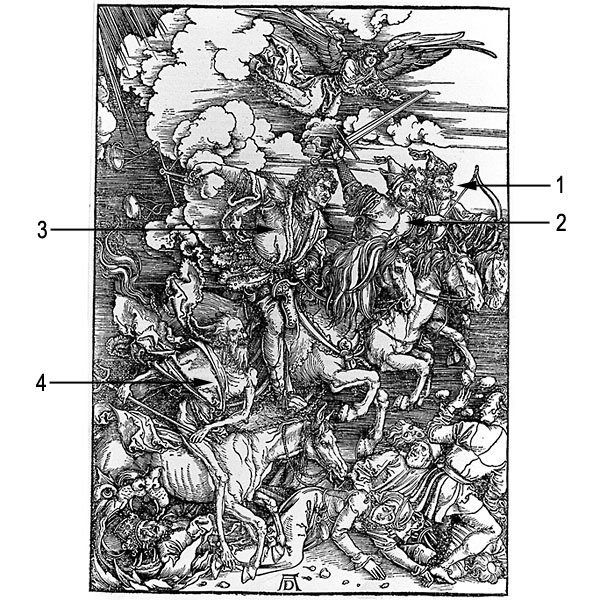 Первое видение знамений (гравюра № 4). Агнец берет у Бога-Отца Книгу Судеб, запечатанную семью печатями. Со снятием четырех из этих печатей перед Иоанном возникают картины знамений, предвещающих близость конца времен. Когда была вскрыта первая печать, появился «гордый всадник» с луком на белом коне (1) — символ могущества Рима (так считает Александр Мень). После второй печати, всадник с мечом на рыжем коне (2) — символ войны. Третий всадник с весами на черном коне (3) означает близящийся голод (весы — символ высоких цен на хлеб). Четвертым всадником покажется Смерть на бледном коне (4)