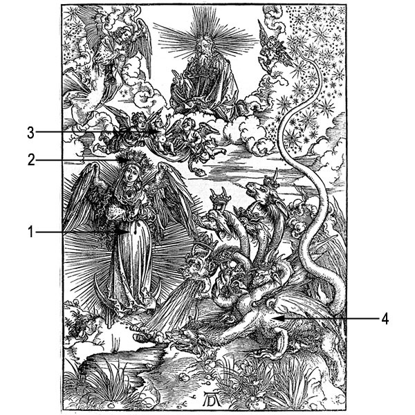 Второе видение знамений (гравюра № 10). Теперь Иоанн видит женщину на сносях (1), стоящую на лунном серпе в окружении семи звезд (2). Роженица — это аллегория Церкви, беременной Иисусом. Звезды — ангелы-хранители. Тут же изображен уже родившийся младенец Христос (3). Этот прием называется симультанностью, когда рядом помещаются события, происходившие в разное время. Симультанность характерна для многих средневековых картин и в особенности для икон. Далее апостол видит, как из моря выходит первый зверь — пурпурный многоголовый дракон (З) — символ Римской империи