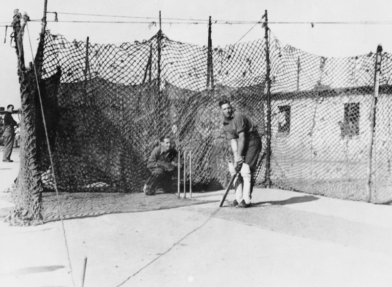 Британские заключенные немецкого лагеря военнопленных Шталаг VIII-B (Stalag VIII-B) играют в крикет.