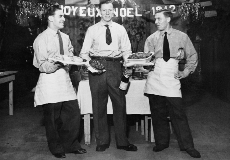 Трое французских пленных с угощением для рождественского стола в немецком лагере военнопленных «Шталаг Люфт III» 25.12.1942