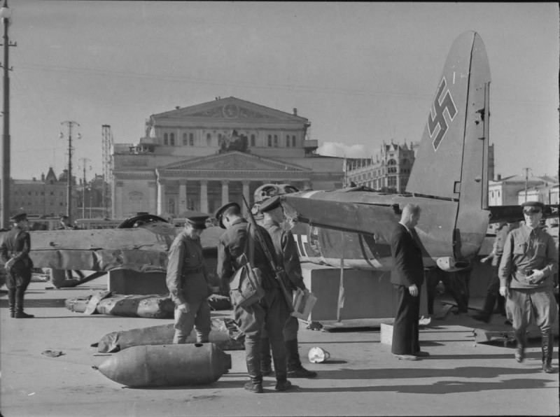 Трофейный немецкий бомбардировщик Ju-88, сбитый советскими силами ПВО, на показе в Москве. июль 1941 года