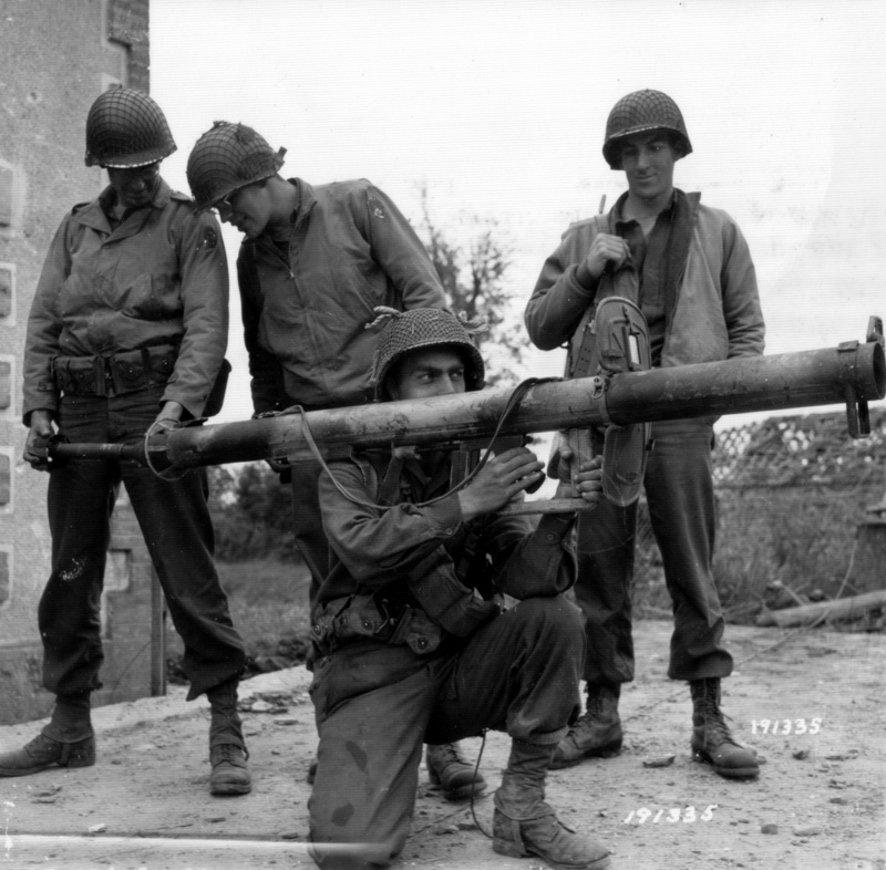 Американские солдаты с немецким 88-мм ручным противотанковым гранатометом «Панцершрек» («Panzerschreck» R.Pz.B.54/1 ). август 1944