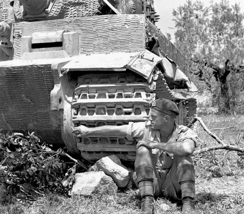 Британский солдат демонстрирует ширину гусеницы танка Pz.Kpfw.VI Tiger Ausf.E. с бортовым №3 из состава 508-го тяжёлого танкового батальона (s.Pz.Abt. 508) вермахта. Италия, 1944 год
