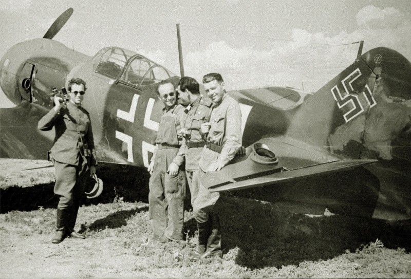 Советские военкоры у захваченного на аэродроме под Армавиром, самолёта Люфтваффе Ла-5Ф, 1943 г.