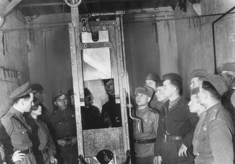 Солдаты и офицеры РККА осматривают гильотину в берлинской тюрьме Плётцензее (Plötzensee). май 1945.