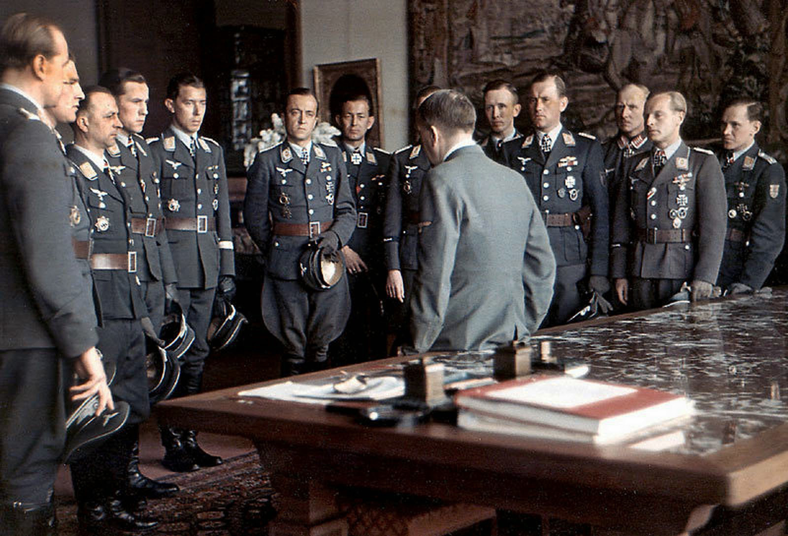 Встреча с Гитлером представителей люфтваффе после церемонии их награждения Рыцарскими крестами с дубовыми листьями. 04.04.1944