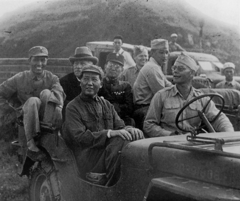 Лидер китайских коммунистов Мао Цзэдун (1893 — 1976, сидит рядом с водителем) и посол США в Китае Патрик Херли (Patrick Jay Hurley, 1883 — 1963; сидит в центре на заднем сиденье) в американском армейском внедорожнике на аэродроме Яньань. 27.08.1945