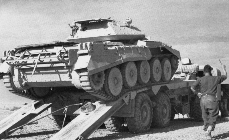 Погрузка британского танка «Крусейдер» (Crusader) на транспортер для доставки к месту боевых действий. 10.12.1941