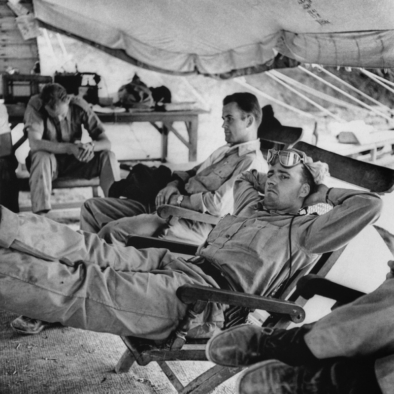 Пилот Том Коул (Tom Cole, на переднем плане) из подразделения «Летающие тигры» в палатке на аэродроме Мингаладон в Бирме. 30.03.1942