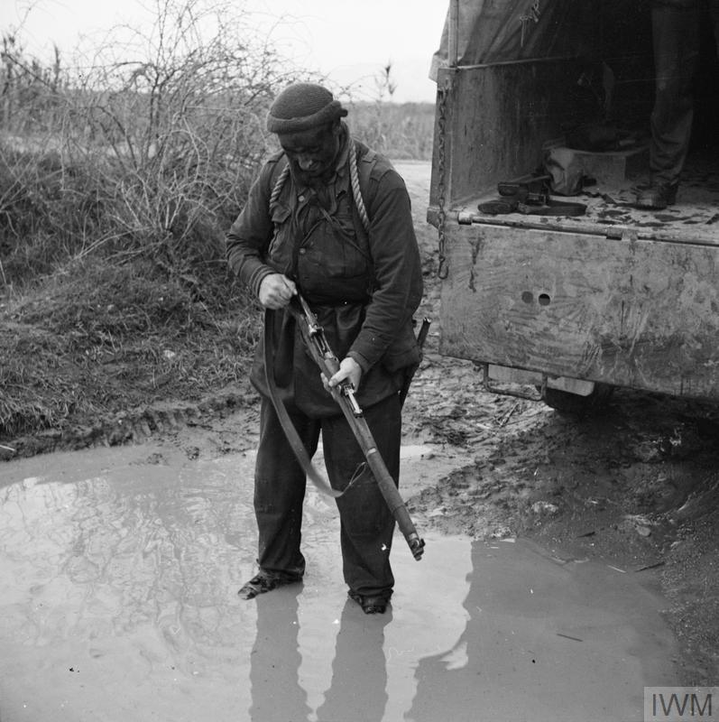 Боец подразделения No. 9 Commando проверяет свою винтовку после рейда по реке Гарильяно. Италия. 30.12.1943.