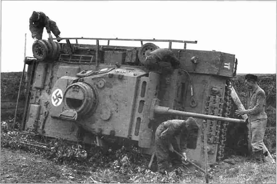 Экипаж пытается выровнять опрокинувшийся танк PzKpfw III Ausf M. 1943 год.
