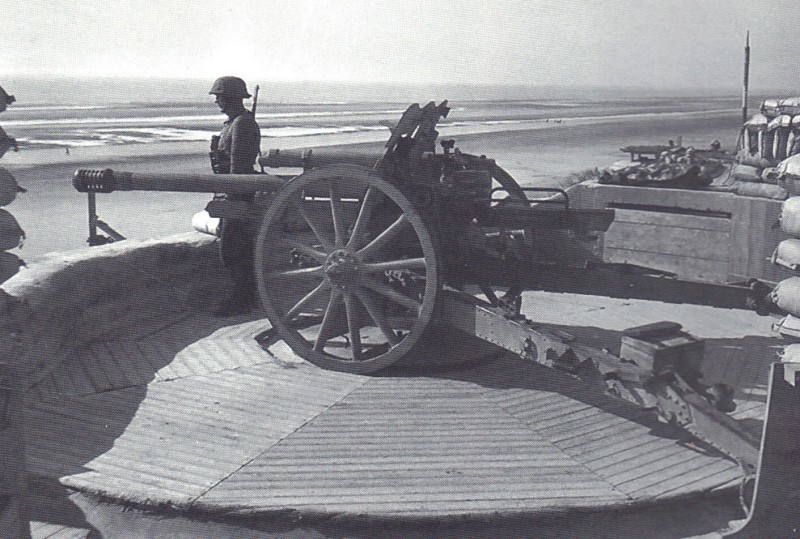 75-мм полевые пушки 7,5 см Feldkanone 38 (7,5 см FK 38) на огневой позиции в немецкой системе береговых укреплений "Атлантический вал". 1942-1944-й года.