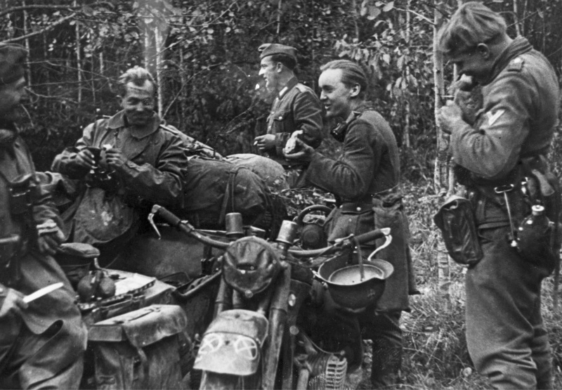 Немецкие мотоциклисты в лесу под Вязьмой. октябрь 1941