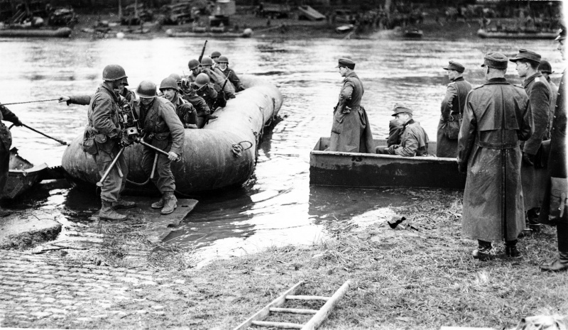 Пленные немецкие офицеры наблюдают за переправой войск 30-й пехотной дивизии США (30th Infantry Division) через реку Везер (Weser) в городе Хамельн (Hameln). 07.04.1945
