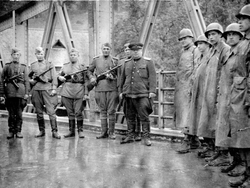 Встреча советского и американского патрулей на мосту через реку Мур в Австрии. май 1945.