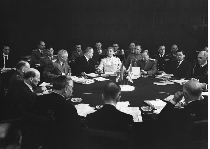 Лидеры «Большой тройки» антигитлеровской коалиции на Потсдамской конференции: председатель СНК СССР и председатель ГКО СССР И. В. Сталин, президент США Гарри Трумэн, премьер-министр Великобритании Уинстон Черчилль. июль 1945