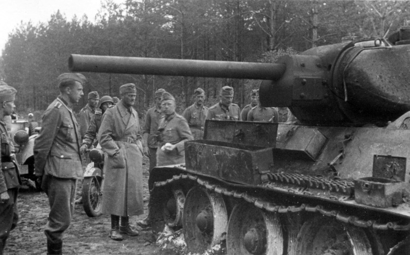 Командир 260-й пехотной дивизии генерал-лейтенант Ханс Шмидт (Hans Schmidt, третий слева) и командующий 43-м армейским корпусом (XXXXIII Armeekorps) генерал пехоты Готхард Хейнрици (Gotthard Heinrici, четвертый слева) осматривают сгоревший советский танк Т-34.