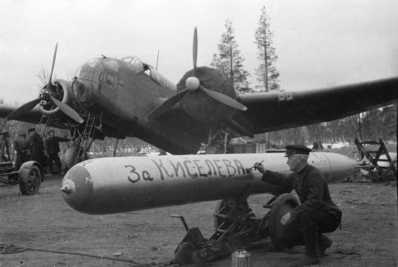 Старшина торпедной группы 24-го минно-торпедного авиаполка А.В. Раков готовит торпеду к установке на самолет Hampden TB.I британского производства. На торпеде — надпись «За Киселева!» — в память о погибшем командире 3-й эскадрильи капитане В.Н. Киселеве.