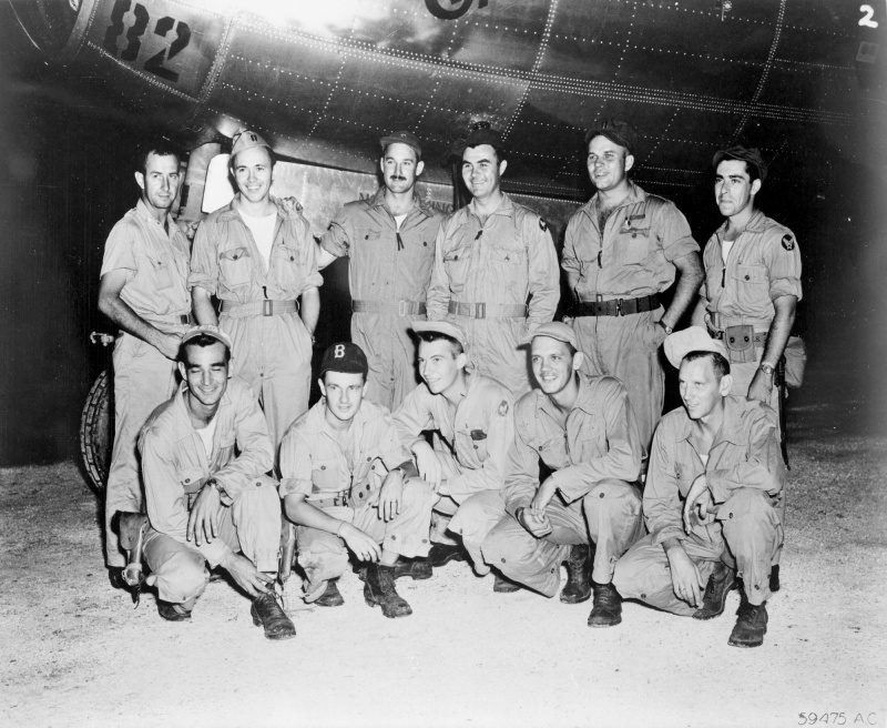 Групповое фото экипажа американского бомбардировщика B-29 «Энола Гэй» (Boeing B-29-40-MO Superfortress «Enola Gay», серийный номер 44-86292) из состава 509-й смешанной авиагруппы США после вылета на атомную бомбардировку Хиросимы.