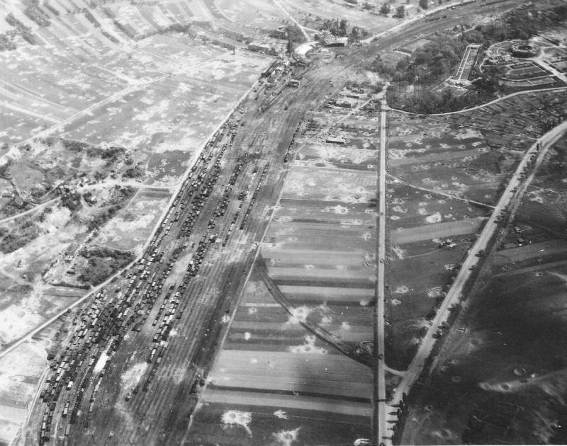 Странная картина - станция и депо практически целые, зато поля, особенно слева, просто перепаханы. Железной дороге тоже досталось — светлые пятна и есть следы попадания.